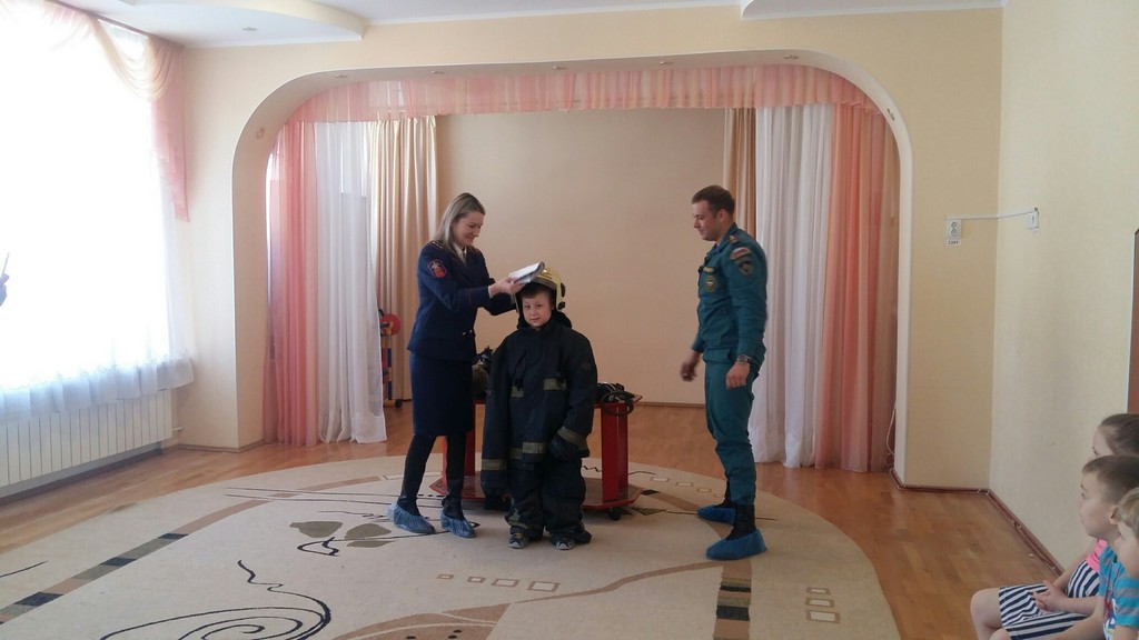 Детям рассказали о возможных причинах пожаров в быту и в образовательном учреждении, о том, как действовать в случае возникновения пожара, показали боевую одежду пожарного, самые смелые даже примерили ее, а также напомнили номера вызова экстренных служб.